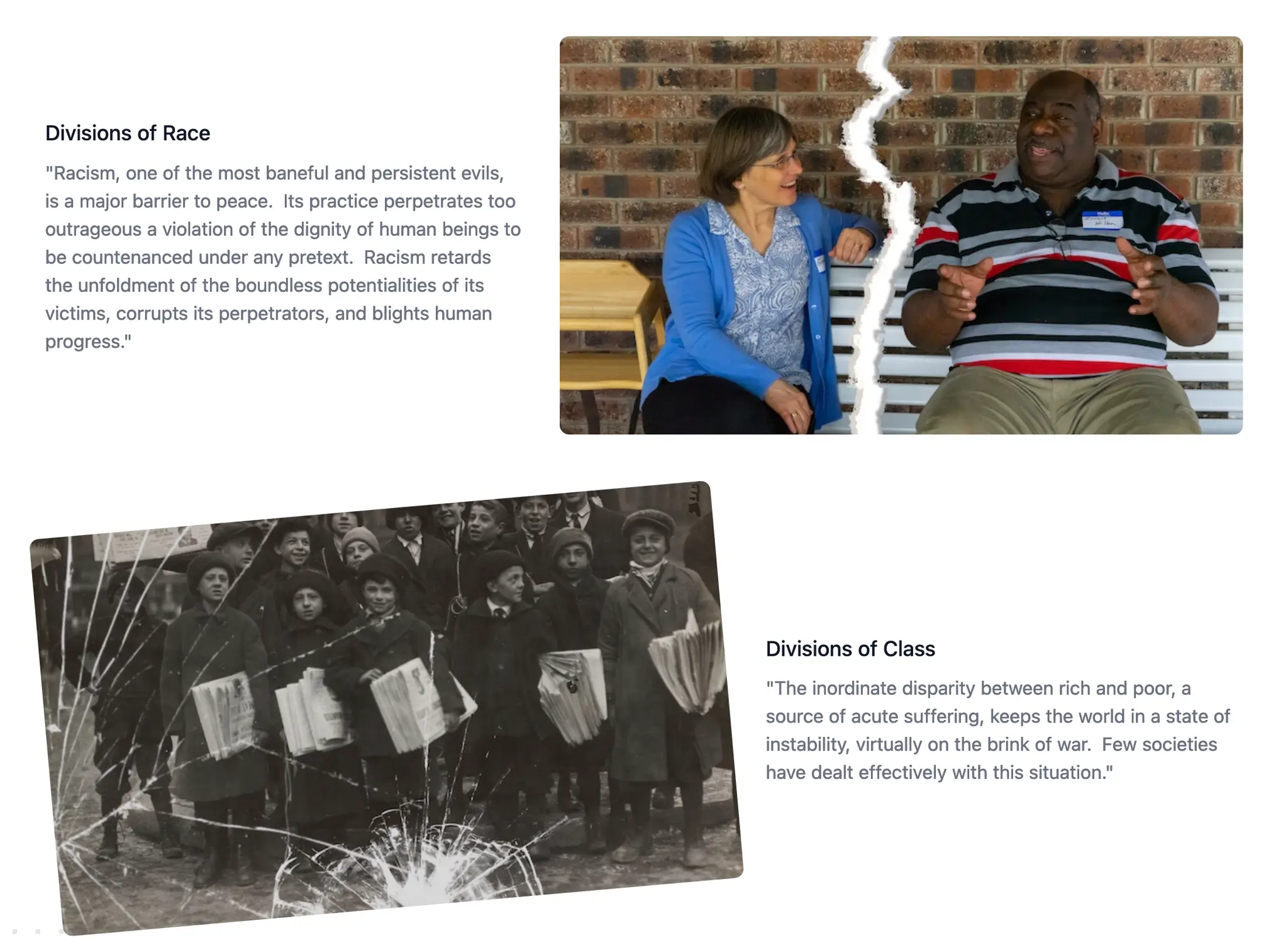 Right from the start a visitor gets the salient details for the upcoming event. Scrolling down they are acquainted with some of the central ideas from the Peace Statement accompanied by symbolic animations representing racial and class divisions.